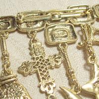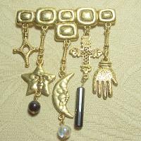 Fascinating brooch by J. J. includes a 3" across ethnic style bar brooch with handing charms, cross, star, moon, hand as well as beads. Longest drop is 3-1/4". Signed on the back.
