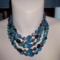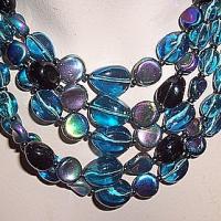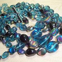 You'll never have These blues again ! Fabulous shades of blue like the ocean accented with darker and a carnival glass beads. This contains both glass and composition so it is not heavy to wear. It features 5 strands with the neck strand being 18" including the extender chain. A gorgeous combination.