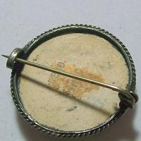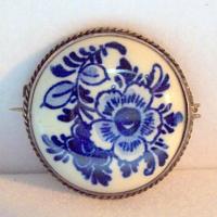 This is a very pretty blue and white signed Delft brooch. It measures 1" across and has a sterling frame and extended pin stem. Slight age crackling to the porcelain otherwise very good condition.