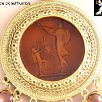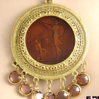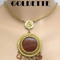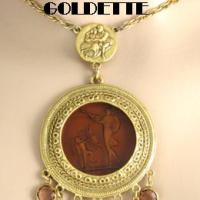 Vintage Goldette intaglio necklace with crystal drops is a magnificent vintage creation. We think the Goldette vintage intaglio jewelry is some of the most beautiful that the company produced. The necklace features a central topaz colored intaglio drop from an ancient metal coin relief dangling light topaz colored crystals that measures approximately 3-5/8 x 2". The gold tone chain necklace measures approximately 19-1/2". The necklace is in Excellent Condition and is signed Goldette in script on the reverse of the necklace. Goldette vintage jewelry was the trademark of the Circle Jewelry Company of New York that was started in about 1958. The final production date of Goldette is not known, but we would date this necklace to the styles of the 1960s. We think this is an elegant example of the beauty of Goldette vintage jewelry and think you will enjoy wearing and collecting this lovely intaglio pendant necklace. (#32563-GoldetteNecklaceIntaglioVintage)