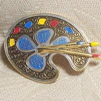 Beautiful painter's palette done in damascene enamel in the traditional black and gold but with the added bright colors of red, blue and yellow. This measures 2-1/4" across and is signed on the back "Spain".