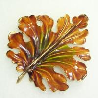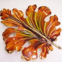 I've seen a lot of earrings that match this pin or a smaller one, but this one measures 3-3/4 x 3-1/4. Brushed goldtone base with burnished brown and green enamel. Like it just fell off of the tree ! A gorgeous fall tribute.