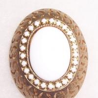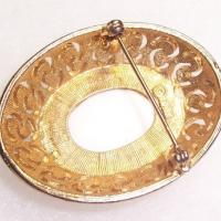 This is a nice brushed goldtone oval brooch by designer HAR. Crescent pierced frame holds a circle of white rhinestones around a large white glass cabochon. The concave design gives this piece a lot of dimension. Very classic and elegant looking. Versatile piece by a collectible designer.