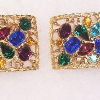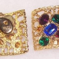 This is a beautiful pair of Musi rhinestone clips featuring an openwork design in goldtone set with various colors and shapes of stones. Measurement is 1-1/2 x 1". Signed on the back.