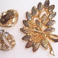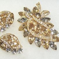 A beautiful estate set by Eisenberg Ice. This set features a 2-3/4" brooch done in goldtone with a bevy of swarovski navettes in a black diamond and palest of amber color. The matching earrings are 1-1/4" and are clip on style. All are accented by pave set crystal rhinestones. These are marked Eisenberg Ice with the copyright symbol. What a beautiful way to sparkle ! Only the best......