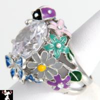 Dior inspired floral enamel and Cubic Zirconia statement ring after the precious Milly-la-Foret design line features a huge, clear Cubic Zirconia stone surrounded and overlaid with highly detailed enameled flowers, a dragonfly and a bee with tiny Cubic Zirconia accents. The face of the ring measures a whopping 1 x 1 and is raised approximately 1/2". This color combination is available in standard Ring Size 9. Said to be the new ring of choice at Hollywood cocktail parties for all the in-the-know stars, we can understand why -- it is simply incredible! Imagine wearing this breathtaking reproduction for a song! Clever you! (#33024-RingCubicZirconiaDiorInspiredClear)