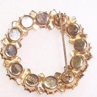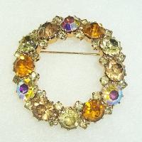 A very pretty rhinestone circle brooch measuring 1-3/4" by Karu Arke, Inc. It features large chatons in amber, ab and jonqil rhinestones. Beautiful sparkle !