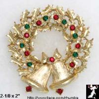 Vintage Christmas wreath and bells pin has red and green crystal rhinestones adorning a gold tone foliage wreath with two gold tone Christmas bells tied together with a gold tone bow with red rhinestone appointed clappers. This nostalgic Christmas wreath with bells pin measures approximately 2-1/8 x 2" and has a safety closure. In Excellent Condition, this charming vintage Christmas wreath with bells pin is a nostalgic image that has been a longtime favorite among vintage Christmas jewelry pin collectors! (#33087-VintageChristmasWreathBellsPinBrooch)
