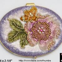 Purse accessory mirror in compact form features a fabulously gorgeous enamel and rhinestone flower cover with fuchsia, pink and AB pink rhinestones and a gold enamel and lemon and topaz color rhinestone bee. This magnificent oval purse compact mirror opens to reveal two mirrors, one magnified, to elegantly do those feminine things like apply lipstick, check contact lenses or freshen one's coiffure in a beautiful way. The soft pearlized shaded lavender and cream background enamel of this lovely piece that is, in every way, a sumptuous piece of jewelry, is complemented by muted shades of pink and gold of the flower and bee as well as green leaves in gold tone metal. It measures approximately 3 x 2-3/4". The compact opens easily to the mirrors with soft pearlized raspberry enamel rims and stays closed with a magnetic closure. A superb gift and useful too! (#33844-MirrorCompactOvalJeweledFlower)