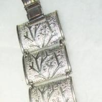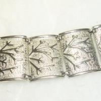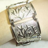 Nice Coro bracelet features a foliage design raised on a textured background. Silvertone bracelet measures 7" x 1-1/4". Very pretty. The shiny design stands out from the textured background.