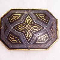 Nice vintage damascene brooch in a rectangular shape with cropped corners, symbolic panels with a cross/star design in the center. Measures 3/4 x 1-1/2". Trombone clasp on the back.