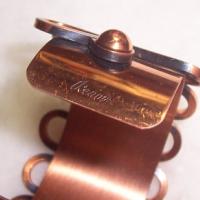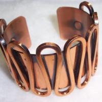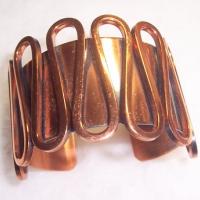 Very nice copper cuff bracelet by Renoir features an applied wavy or loop design. Width measures 2". Bracelet is signed on the outside end.