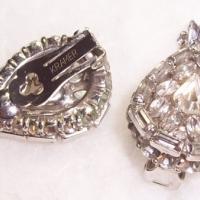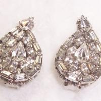 Beautiful pair of Kramer rhinestone earrings featuring a layered design with a variety of rhinestone shapes and sizes. These are silvertone base and clip on style. Measurement is about 1-1/4". Fabulous !
