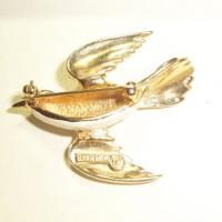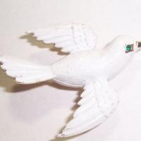 Lovely white dove in flight is by Castlecliff and measures 1-1/2". White enameling on goldtone with a blue rhinestone eye. Just a tiny bit of enamel wear but still a beautiful symbol of peace to wear on your lapel.