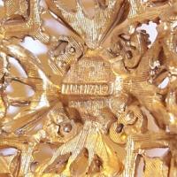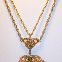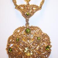 Beautiful brushed goldtone necklace by Florenza features a double 20" textured chain with O-ring clasp at the back. 2-1/2" pendant and bale design hosts lovely peridot, green and jonquil rhinestone display with faux pearl accents. Pendant signed Florenza.