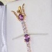 Beautiful Amethyst oval stones accented by small crystal cz's are set into a single strand bracelet. Sterling Vermeil measures just over 7" and 1/4" wide. Gorgeous stones. Safety closure. Amethyst is the birthstone for February and also the Anniversary stone for the 4th and 6th year of marriage. Greek legand says "The god of wine, Bacchus, was insulted one day by a mere mortal. He swore the next mortal that crossed his path, would be attacked by his fierce tigers. Along came a beautiful maiden named Amethyst. Goddess Diana turned Amethyst in a beautiful statue of quartz to save her from the tigers claws. Remorseful Bacchus wept tears of wine over the stone maiden, creating a lively purple stone. " . The Amethyst has always been considered a "Royal" stone and is found in many crown jewels.