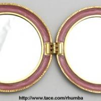 Purse accessory mirror in compact form features a fabulously gorgeous enamel and rhinestone jeweled cover and opens to reveal two mirrors, one magnified, to elegantly do those feminine things like apply lipstick, check contact lenses or freshen one's coiffure in a beautiful way. The pearlized background enamel of this lovely piece that is, in every way, a sumptuous piece of jewelry, is expertly enameled in shades of lavender, orchid and plum with green leaves accented with pink and rose colored rhinestones in goldtone metal. The compact opens easily to the mirrors with flattering lavender enamel rims and stays closed with a magnetic closure. A superb gift and useful too! (#363-MirrorCompactLavendePinkRoserEnamelRhinestone)