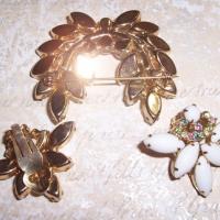 A beautiful set featuring a white rhinestone wreath design accented with pastel rhinestone chatons. Brooch measures 2-1/4". Matching earrings are about 1" + and are clip on style. Fabulous set !