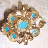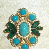 Beautiful Sarah Coventry brooch done in goldtone with turquoise cabochons and emerald green rhinestones accented by crystal rhinestones. This measures 2-1/2" and is signed Sarah Cov on the back. It is a pendant as well as a brooch. Gorgeous !
