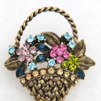 Basket pin is brimming over with luscious rhinestone grapes and in Aurora Borealis mint, Aurora Borealis topaz and Aurora Borealis pink rhinetones and bright red rhinestone cherries. The basket is cross hatched with clear rhinestones in silver tone metal and there are beautiful, textured, sheer green enamel leaves. This lavish grapes and cherries basket pin measures approximately 1-1/4 x 1-1/4" and has a safety closure. Perfect enough for a still life! (#36665-BasketPinBasketPinRhinestoneGrapesCherries}