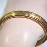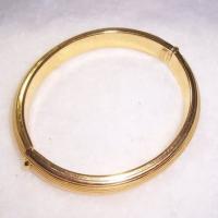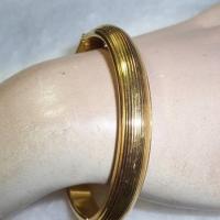 This is a nice "engine-turned" style bangle bracelet by Trifari. It measures 2-1/2" inside diameter or fits a size 7 bracelet size. Hidden closure on the side and 1/4" wide. Very pretty to wear alone or mix with others !