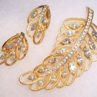 This is a very nice floral design leaf spray brooch measuring 3" and featuring a bright brushed goldtone finish and sparkling navette rhinestones. The matching clip on earrings are 1".