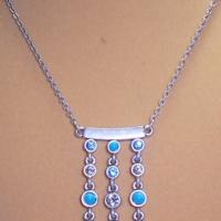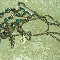 Beautiful necklace by Lia Sophia featuring silvertone matte chain measuring 18" and 2-1/2" waterfall design with turquoise and blue rhinestones in the front. Lobster clasp and signed tag.
