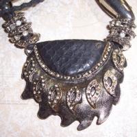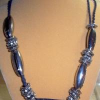Bold necklace features large hollow silvertone beads on a twisted fabric cord with rhinestone rondelle accents. The front is a 2" pendant with black faux snake skin ? and brushed silvertone with tiny rhinestone accents. This is signed Wilma Spagli Italy.