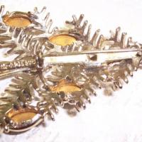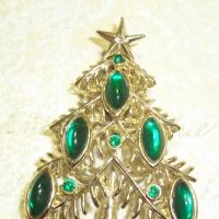 Very pretty Tancer II Christmas tree pin measures 2" high and features a light goldtone finish with emerald green navette glass cabochons with smaller rhinestone accents.