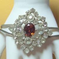 A fantastic vintage set in the Art Deco style features a double silvertone chain 15" with slide in rhinestone clasp at the back and front 1-1/2" rhinestone focus in crystal a deep amber. The matching bracelet is 7". This has a "slide" look to it but the stations do not slide.