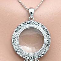 Lorngette magnifier pendant necklace is a stunningly elegant and useful jewelry accessory. This beauty features a quality magnifier in a textured, bright silver tone and clear rhinestone bezel with a rhinestone embellished handle. The magnifier pendant measures approximately 2-7/8 x 1-3/8" including the generous bail. The magnifier is approximately 7/8" round. The lorgnette comes on its own faceted bead chain that is adjustable from 24 to 26" with a secure lobster clasp closure and chain. Women have used lorngettes since the 1800s as an alternative to wearing spectacles to see a program, to view a menu or simply as a beautiful affectation. This is a "must have" for antique collectors and dealers and especially those who, like jewelry collectors, need to be able to see small markings and have a magnifier handy at all times. The nice thing about this one is that you can wear it with just about anything as it is as functional as it is beautiful and you will always have it handy as well. We consider ours part of our jewelry collecting "uniform" and we get lots of compliments on it as well! You will too! Makes a great and welcome gift for just about any collector who appreciates beautiful things! (#28287-LorgnetteMagnifierPendantNecklaceSilverTone)