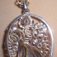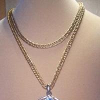 Beautiful 2-1/2" pendant by Napier features aqua blue rhinestones in an openwork floral setting. This hangs from a 32" goldtone chain with spring-ring clasp. I do not know if this is the original chain. The pendant is gorgeous. Light wear to the back. Signed Napier at the top of the pendant.