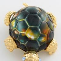 Turtle brooch pin in gold tone metal, with a mottled green, gold, and teal lucite "shell", and light blue rhinestone eyes. From nose to tail, this charming brooch measures 2-3/8", and from toe to chubby little toe he measures 1-1/2". He will hug you all day and night, staying secure with a safety closure. His unique lucite shell shimmers and changes with your every movement. His shell, paired with his twinkling eyes are sure to catch the eye and capture the heart of every turtle lover! (38325- TurtlePinBroochLuciteRhinestoneGoldTone)