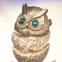 Owl pin has a wonderful image of this wise bird with round, twinkling emerald green rhinestone eyes surrounded by tiny root beer topaz colored rhinestones. This intellectual bird pin boasts beautiful enamel work in pearlized shades of gold and brown with a Light Colorado Topaz colored rhinestone pave belly and golden topaz and Light Colorado Topaz colored rhinestone accents on his wings and tail feathers. He measures approximately 1-3/4 x 7/8" and has a safety closure as well as a generous bail to allow you to wear it as a pendant as well as a brooch. The generous bail will accommodate your choice of chains, cables, cords and ribbons to give you lots of different fashion looks to suit your mood and outfit. An educated choice for the discriminating owl pin collector, student, teacher or anyone who loves this superb bird! (#39047-OwlPinRhinestoneEnamelTopaz)