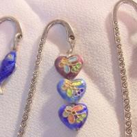 Silvertone 3-1/2" bookmarks carry an etched design and each holds a different charm. Some of the charms are sterling silver. $5.00 each