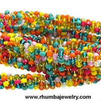 Bangle bracelet set of seed bead wrapped bangle bracelets in confetti colors is just the thing to spice up your wardrobe! Miriam Haskell was known for her seed pearl and seed bead wrapped bangles and now beaded jewelry is an important trend in fashion. Here's an updated, contemporary take in both transparent and opaque seed beads in fuchsia, turquoise, bright yellow, pink, green white and clear seed beads wrapped around sturdy silver tone metal bases. The bracelets are rounded and 1/4" wide with roomy inner dimensions of approximately 2-5/8". Wear these beauties together or alone, layer them with others up to your elbow for an au courant look that will give a Boho, Hippie Chic or perhaps Native American look. You will enjoy having these fun seed bead wrapped bangles in multicolors to express your own individual fashion personality and style! (#398190-BangleBraceletSetSeedBeadWrapped)