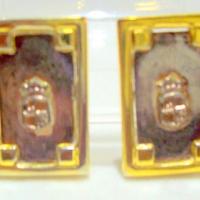 Nice pair of classic earrings by Liz Claiborne. These measures 1 x 1-1/2" and are clip on style. Design is Art Deco with a shield or logo in the center combining both silver and goldtone.