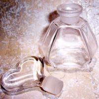 Very pretty crystal clear perfume bottle with heart shape ground stopper. Bottle measures 4" high and just over 2" wide at the bottom. Fill it with your favorite fragrance for a lovely dresser display.