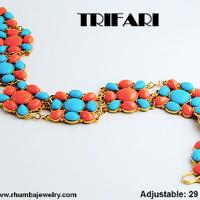 Vintage Trifari belt of huge cabochons of simulated turquoise and coral in round, oval and pear shapes in rich gold tone metal is a showstopper! This impressive and rich vintage Trifari belt is adjustable from 29 to 36" with a gold tone hook and extender chain. This rare example of vintage Trifari jewelry is in Excellent Condition and has the Trifari hang tag that was first used in 1954 although we believe the belt dates closer to the 1960s. The inimitable use of coral and turquoise with gold tone by Trifari continues to be a stellar look in fashion accessories. In Excellent Condition and direct from an estate, this is one spectacular find! (#40506-TrifariBelt)