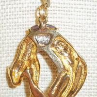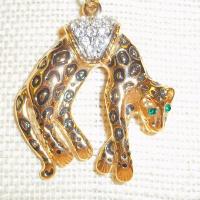 Beautiful leopard/cat pendant measures 1-1/2" and features a goldtone base with crystal rhinestones and green rhinestone eyes. Very nice detail and hangs from a matching 24" chain. This is signed inside T C on an oval cattouche. Great quality.
