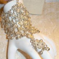 This is a middle eastern slave bracelet and matching necklace featuring hundreds of woven tiny beads, rings and flowers. The necklace measures 18" neck with 5" drop front. The bracelet is 7-1/2" and has a finger-ring at the end with charms. It was very difficult to test this but it is not sterling. It did test 800 in some places.
