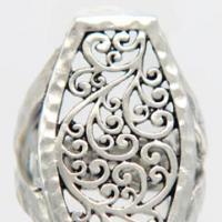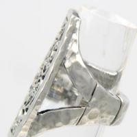 Stretch ring of silver tone metal that looks like a sterling silver, hand hammered, artisan ring with open filigree work is a stunner! This sumptuous bright silver tone stretch ring has an elongated face that measures approximately 1-3/4 x 1-1/4" and has a continuous stretch shank that will comfortably adjust to fit just about everyone. Whether your fingers are swollen due to pregnancy or arthritis or your knuckles are large, you can now wear beautiful fashion rings again. This beauty will fit on any finger on any given day. Fashionistas love these stretch rings simply because they are beautiful and easy to pop on in a hurry. They make great gifts too because you never have to worry about size. This beautiful artisan hammered look silver tone ring will make your hands look beautiful and elongate your fingers with its lovely designer filigree shape. You will be pleased. (#40859-StretchRingElongatedSilverToneOpenFiligree)