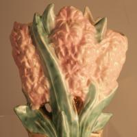 Very attractive pair of McCoy Pink Hyacinth Vases. Circa 1950's. Great pink color with contrasting green leaves and some brown trim. Gloss finish.