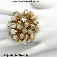 Stretch ring is a gathering of big, juicy Aurora Borealis purple and blue metallic briolette crystals with fancy antiqued brass color bead caps in patinated brass colored metal is a darkly colorful and mesmerizing beauty. The crystals are wired into the ring and do not move, but their colors dance and shoot fiery sparks of colorful light with your every movement. The cluster of crystals measures approximately 1-1/2 x 1-1.2" and is approximately 1" raised from the base on an adjustable stretch shank that will fit almost everyone comfortably on any finger on any given day. Whether your fingers are swollen due to pregnancy or arthritis or your knuckles are large, you can now wear beautiful fashion rings again. Fashionistas love these stretch rings simply because they are beautiful and easy to pop on in a hurry. They make great gifts too because you never have to worry about size. You will love the array of colors reflected in this beautiful crystal stretch ring to go with browns, purples, blues, black, gray and tans. Simply luxurious and a darkly opulent choice! (#40915-StretchRingABBluePurpleCrystalsPatBrassColor)