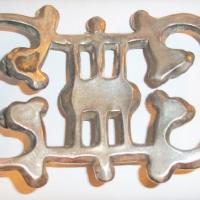 Very heavy silvertone buckle (possibly stainless steel) with a freeform design measures 2-1/2 x 3-1/2". It is marked on the reverse 1974 Bakke.