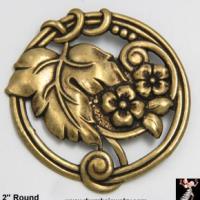 Vintage Art Nouveau brooch is a repousse stamping in antiqued brass with a floral theme. This delightful vintage Art Nouveau pin measures approximately 2" round and has a safety closure. It is in Excellent Condition and dates to Ca. 1924. If you love Mucha and Beardsley, you will love having this vintage Art Nouveau pin with its great floral motif of puffy posies, a stunning leaf and trailing vine circular border that shows hints of the transition to Art Deco. A romantic Art Nouveau design that will make a wonderful wardrobe accessory in your uniquely individual style! (#41601-ArtNouveauVintageBrooch)