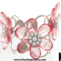 Cuff Bracelet Pink Lucite Rhinestone Flowers Cuff Bracelet
