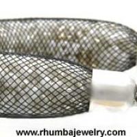 Stretch bangle bracelet of caged pearlized and gold tone seed beads in a mesh tube with a stretch section of multiple gathered silver tone links. This outstanding new, contemporary stretch bracelet is approximately 5/8" wide and is adjustable to stretch and fit just about everyone comfortably. Whether your hands are larger or you have difficulty fastening bracelet clasps on yourself, this bracelet will be a beautiful and unique fashion accessory to pop on in a hurry to give your outfit a finished look. Wear it alone or layer it with others. Team it up with our matching caged seed bead necklace sets shown below. You will get lots of compliments while you will occupy yourself by staring at the collection of beautiful seed beads contained within it. (#41777-StretchBangleBraceletCagedBeads)