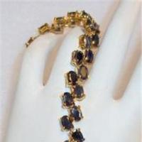 This is a gorgeous estate tennis style bracelet featuring ebony sapphire stones set in sterling vermeil in an attractive design. The bracelet measures 7-1/4" x 3/8" wide and has a slide in safety clasp. This is signed DJB? and then 925 on the clasp area. Stones all tested out as sapphires - very dark and lush. These are in a blue velvet box marked ice.com which may be the designer/manufacturer. This looks never worn and is beautiful.
