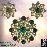 Vintage rhinestone brooch / pin and clip earrings set in pink and red navette and round crystal rhinestones that are all-prong-set in gold tone metal. This set is a dead ringer for Judy Lee and although we looked and looked, we could not find a signature. The pin measures a generous 2-1/2 x 1-1/2" and has a safety closure. The matching earrings measure a generous 1-1/2 x 1" with sturdy and secure ear clips that retain their original tension. In Excellent Condition, we think this is a beautiful, vintage brooch and earrings set that would have made Judy Lee proud! (#41884-RhinestoneBroochPinEarringsSetPinkRed)